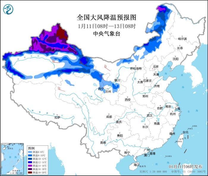 11日08时至13日08时,新疆大部、甘肃中西部、宁夏中南部、内蒙古大部等地气温下降6~10℃,新疆北疆大部降温12~18℃,局地20℃以上,上述地区将有4~6级风,阵风7~8级,新疆山口风力可达8~10级(见图2)。中央气象台1月11日06时继续发布寒潮蓝色预警。
